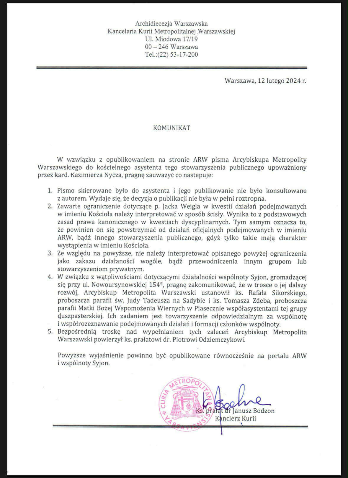 Uzasadniając tę zaskakującą decyzję, kanclerz warszawskiej kurii, ks. Janusz Bodzon, w komunikacie z 12 lutego 2024 r. stwierdził, iż treści wspomnianego listu kard. Nycza „nie należy interpretować […] jako zakazu działalności w ogóle, bądź przewodniczenia innym grupom lub stowarzyszeniom prywatnym”.