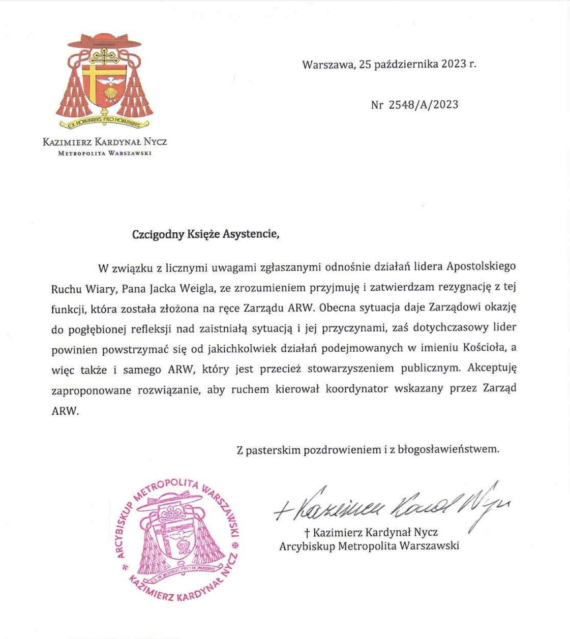 25 października 2023 roku kard. Kazimierz Nycz w liście do asystenta kościelnego ARW napisał: „W związku z licznymi uwagami zgłaszanymi odnośnie działań lidera Apostolskiego Ruchu Wiary, pana Jacka Weigla, ze zrozumieniem przyjmuję i zatwierdzam rezygnację z tej funkcji, która została złożona na ręce Zarządu ARW. […] dotychczasowy lider powinien powstrzymać się od jakichkolwiek działań podejmowanych w imieniu Kościoła, a więc także samego ARW”.
