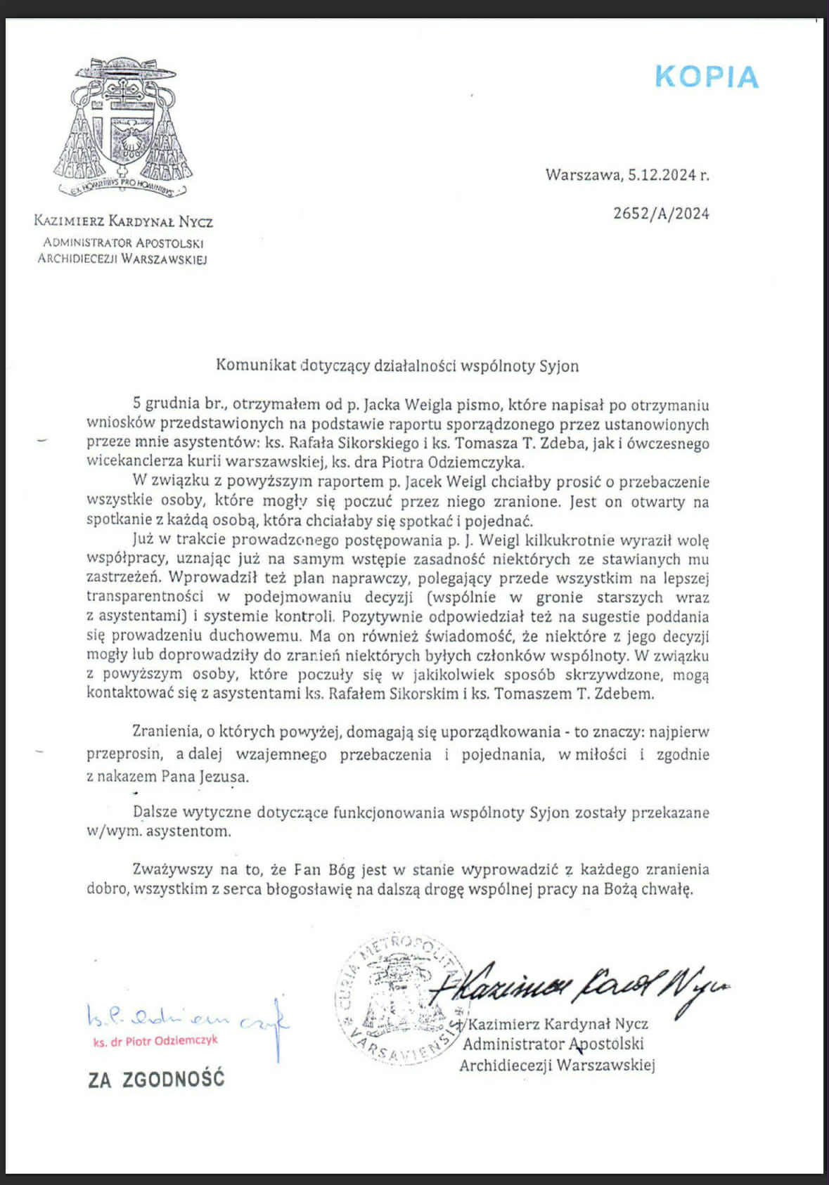 Apogeum tego kryzysu zaufania nastąpiło w grudniu 2024 roku, kiedy to archidiecezja wydała komunikat podpisany przez samego kard. Kazimierza Nycza.