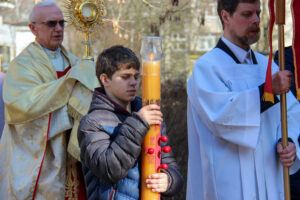Triduum Paschalne staramy się przygotować dobrze. W Wielki Czwartek i Piątek liturgia rozpoczyna się o 20:00, a Wigilię Paschalną rozpoczynamy o 22:00. Zwykle u nas pozostało chłodno i leży trochę śniegu, więc liturgia światła oraz ognisko koło kościoła w noc paschalną realizowane są w zimowej scenerii. Rezurekcja, ze względu na nocną liturgię, odprawiana jest w godzinach przedpołudniowych.